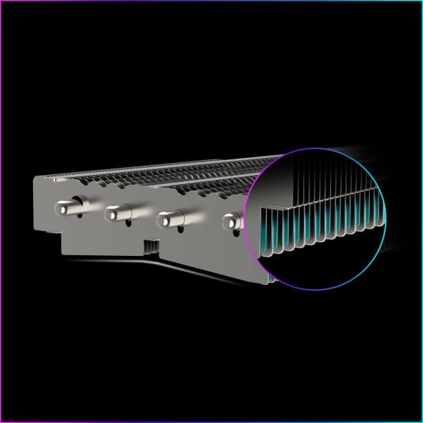 De zorgvuldig berekende heatsinkvinnen met V-profiel en hoog-laag ontwerp zijn millimeterprecies geplaatst in het pad van de luchtstroom. Dit optimaliseert de luchtstroom, verlaagt de luchtweerstand en verhoogt de koelprestaties.